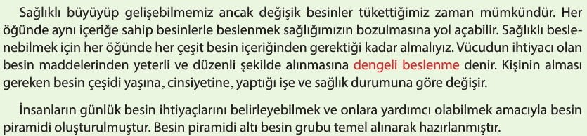 Besin Piramidi: Besin piramidi, sağlıklı bir beslenme düzenini gösteren bir grafiktir. Besin piramidinin en alt kısmında, vücudun temel ihtiyacı olan karbonhidratlar ve tahıllar bulunur. Orta kısımda, protein kaynakları ve süt ürünleri yer alır. En üstte ise yağlar ve şeker içeren besinler daha az tüketilmesi gereken kısımda bulunur.
