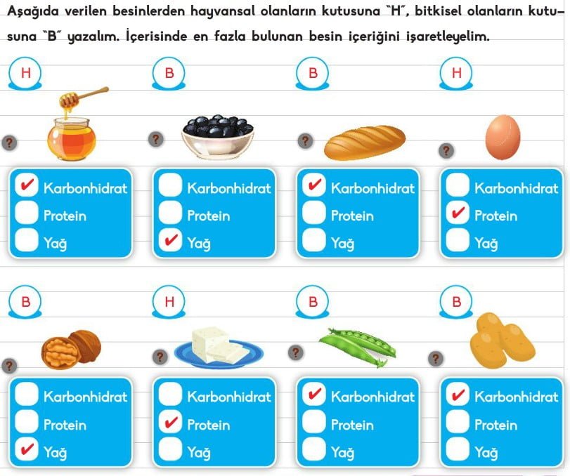- Soru: Yağların görevleri nelerdir? Verilen besinler arasından yağ kaynaklarını sıralayınız.