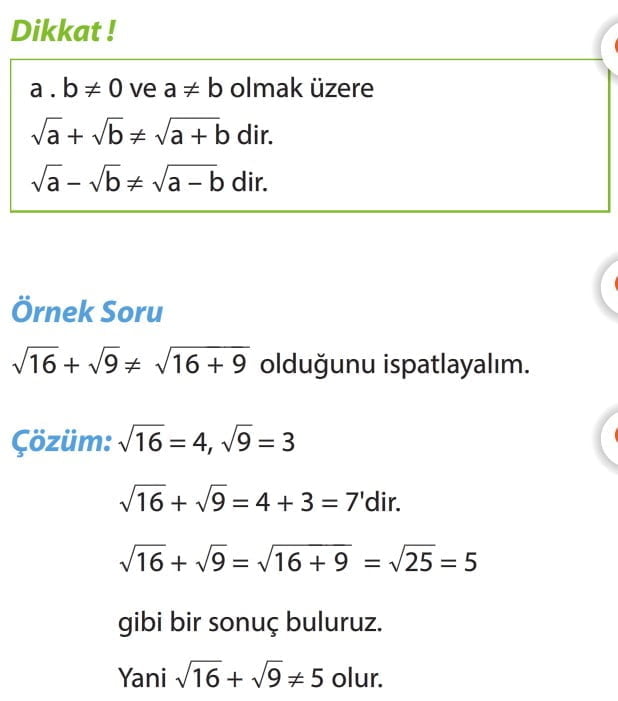 - √a + √b = √(a + b): Aynı radikand ve kök derecesine sahip iki ifade toplandığında, bu iki ifadenin toplamının karekökü elde edilir.