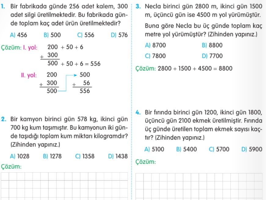 Etkinlikler: 4. sınıf öğrencileri için zihinden toplama becerilerini geliştirmek ve pekiştirmek için kullanabileceğiniz etkinlikler aşağıda sıralanmıştır: